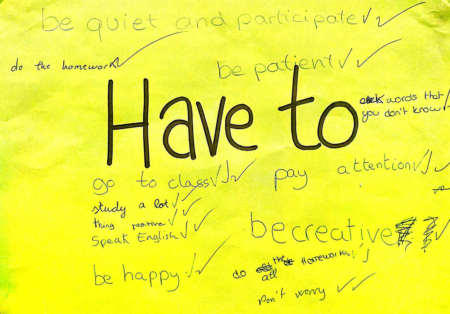 In our first lesson, I had students work together to come up with a list of behaviors exhibited by “good language learners”. For example, they’d come up with “good language learners speak in English during class time” or “good language learners do their homework.”